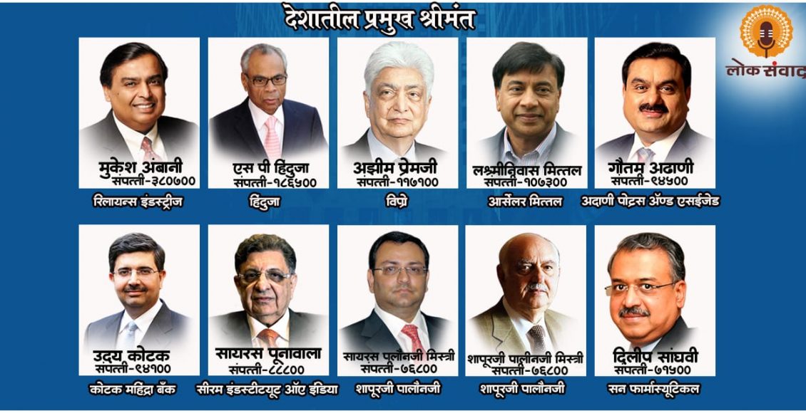 - 8/9 शापुर पालोनजी मिस्त्री, शापुरजी पालोनजी ग्रुप. संपत्ती ७६,८०० कोटी रुपये. बांधकाम, टेक्स्टाइल, होम आपलायन्सेस, शिपिंग, पब्लिकेशन, ऊर्जा आणि बायोटेक्नॉलॉजी अशा विविध क्षेत्रात कार्यरत शापुरजी पालोनजी हा ग्रुप कार्यरत आहे.